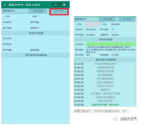 5、充值成功后將燃氣卡芯片朝下插入藍牙讀卡器中,點擊寫卡可將儲存余額轉(zhuǎn)充成氣量。(如顯示寫卡不成功,可再次點擊寫卡重試,轉(zhuǎn)氣時不能關(guān)閉藍牙。)