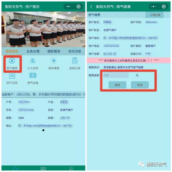 1、打開手機微信搜索衡陽天然氣或掃描下方公眾號二維碼進行關(guān)注。點擊公眾號燃氣服務(wù)選項選擇開始,進入繳費平臺界面。