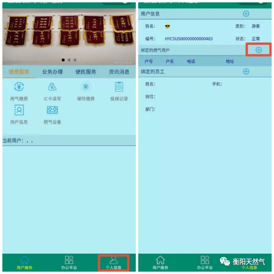 2、點擊右下角個人信息選項,按+字符號綁定戶號、手機號、身份證號碼。(綁定內(nèi)容需與開戶資料一致)。
